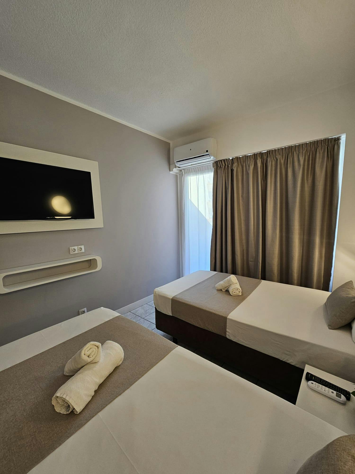 Die Zimmer sind so gestaltet, dass sie Komfort und Ruhe bieten. Alle Zimmer verfügen über eine Klimaanlage, einen Kleiderschrank, eine Terrasse mit Aussicht, ein eigenes Bad, einen Flachbildfernseher, Bettwäsche, Handtücher und einen Safe. Darüber hinaus steht Ihnen in der gesamten Unterkunft kostenloses WLAN zur Verfügung. Ein Haartrockner ist auf Anfrage an der Rezeption erhältlich.