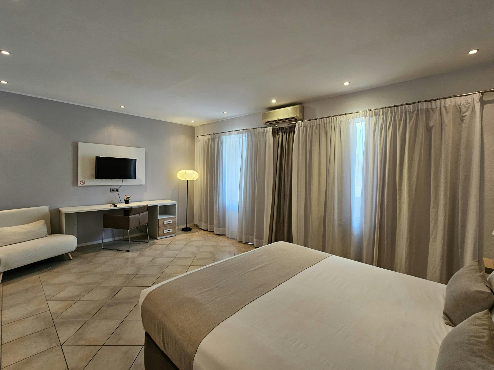 Wunderschöne Suite mit separatem Wohnzimmer mit Sofa, elegantem Schreibtisch und eigener Terrasse. Sie verfügt über ein Doppelbett oder zwei Einzelbetten, die den Komfort unterstreichen und die ruhige und gemütliche Atmosphäre unserer Suite zu einem Ort der Erholung und des Komforts machen, ideal für eine Geschäftsreise oder einen Kurzurlaub mit Ihrem Partner oder Ihrer Familie.